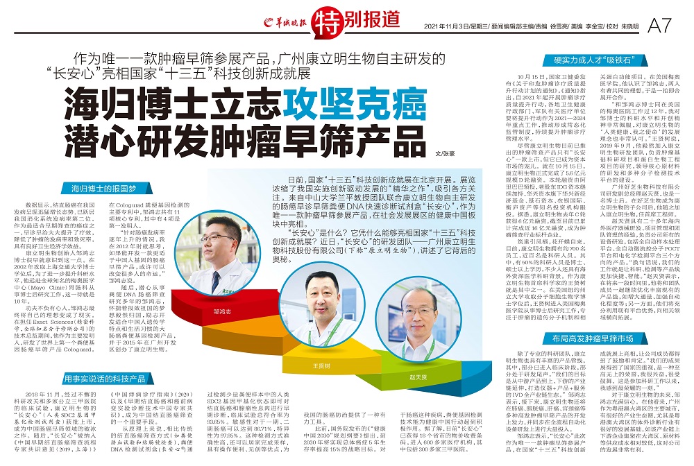 引言:日前,“長安心”產(chǎn)品在“十三五”科技創(chuàng)新成就展亮相,吸引了各界的關(guān)注??盗⒚魃飫?chuàng)始人、腸癌早篩技術(shù)發(fā)明人鄒鴻志博士及科學(xué)家團(tuán)隊(duì)接受媒體記者采訪,暢談科技報國、潛心研發(fā)腫瘤早篩產(chǎn)品的心路歷程。