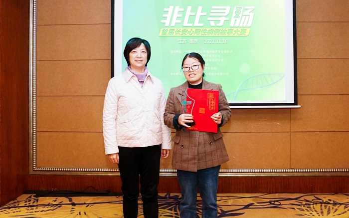 經(jīng)過激烈的角逐,最后來自江蘇省省級機(jī)關(guān)醫(yī)院的選手尹冬華奪得了冠軍獲得專家評審團(tuán)的一致認(rèn)可,成功奪得“非比尋腸”首屆長安心病例故事大賽華東區(qū)決賽冠軍,從本次大會主席周衛(wèi)紅主任手中接過了頒發(fā)的獎狀。