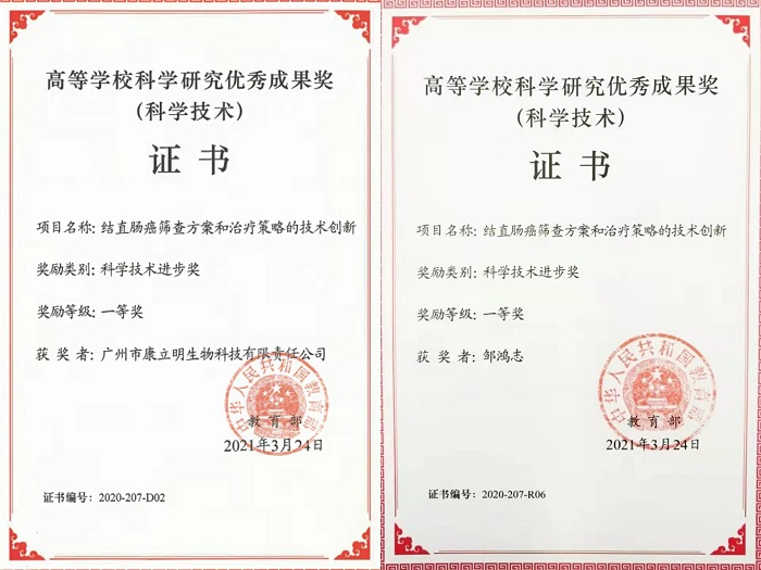 3月24 日,康立明生物及創(chuàng)始人鄒鴻志博士申報(bào)的《結(jié)直腸癌篩查方案和治療策略的技術(shù)創(chuàng)新》項(xiàng)目榮獲教育部科學(xué)技術(shù)進(jìn)步獎(jiǎng)一等獎(jiǎng)。
