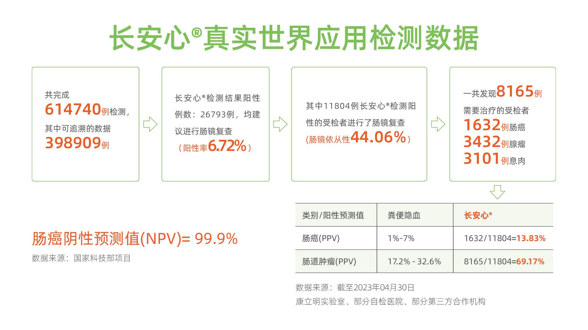在“人類健康,我之使命”崇高理想下,發(fā)揚(yáng)康立明生物的社會(huì)責(zé)任與擔(dān)當(dāng)精神,以長(zhǎng)安心®等腫瘤早篩產(chǎn)品的優(yōu)越性能,引領(lǐng)行業(yè)的技術(shù)標(biāo)準(zhǔn),創(chuàng)新的公共衛(wèi)生篩查模式,加大人群的參與度來實(shí)現(xiàn)腫瘤的早診早治。來自康立明醫(yī)學(xué)檢驗(yàn)實(shí)驗(yàn)室、部分自檢醫(yī)院、部分第三方合作機(jī)構(gòu)的數(shù)據(jù)顯示:截至2023年4月30日,長(zhǎng)安心®共完成614740例檢測(cè),其中可追溯數(shù)據(jù)398909例。長(zhǎng)安心®檢測(cè)結(jié)果陽性數(shù)26793例(陽性率6.72%),均建議進(jìn)行腸鏡復(fù)查,其中11804例長(zhǎng)安心®檢測(cè)陽性受檢者進(jìn)行了腸鏡復(fù)查(腸鏡依從性44.06%)。