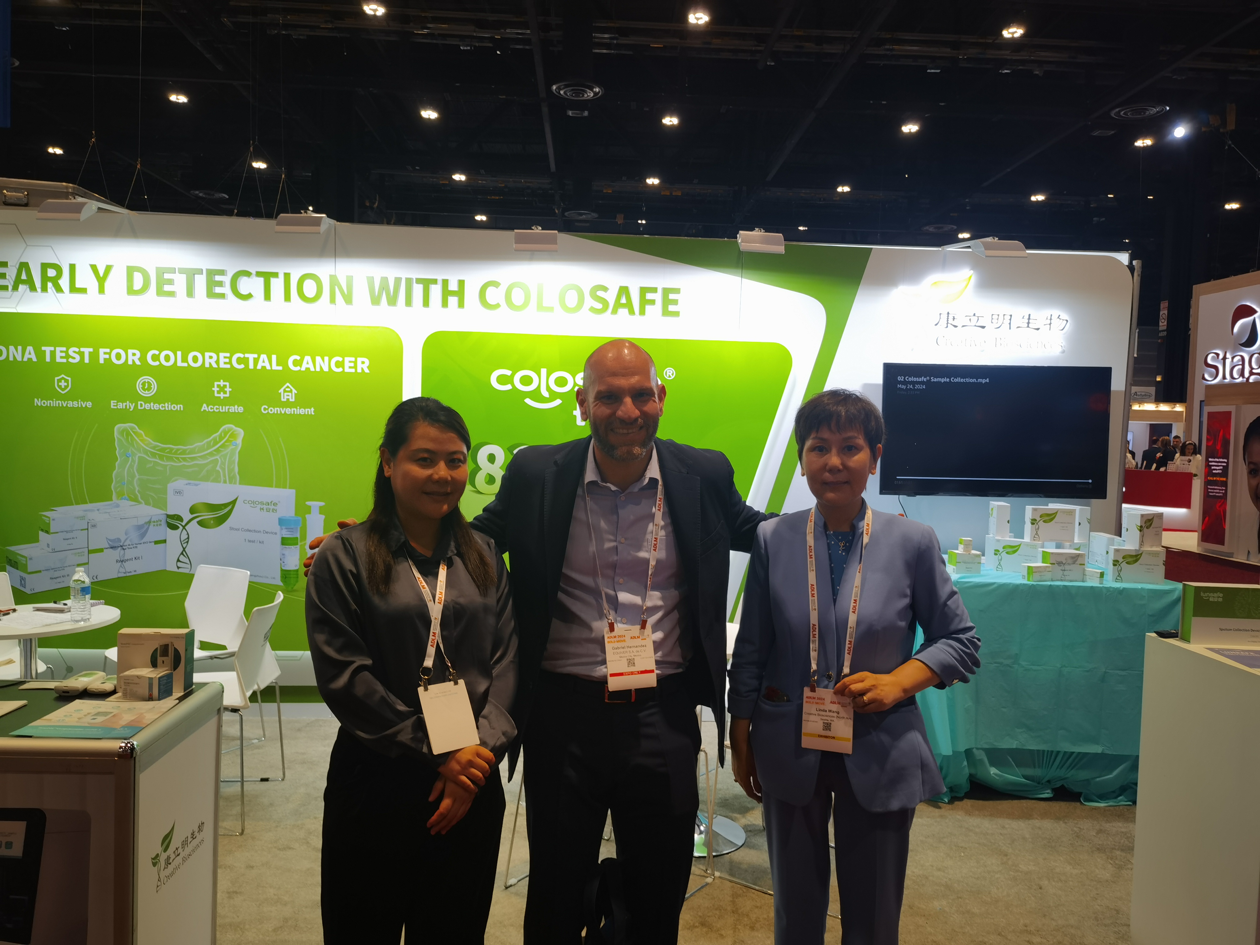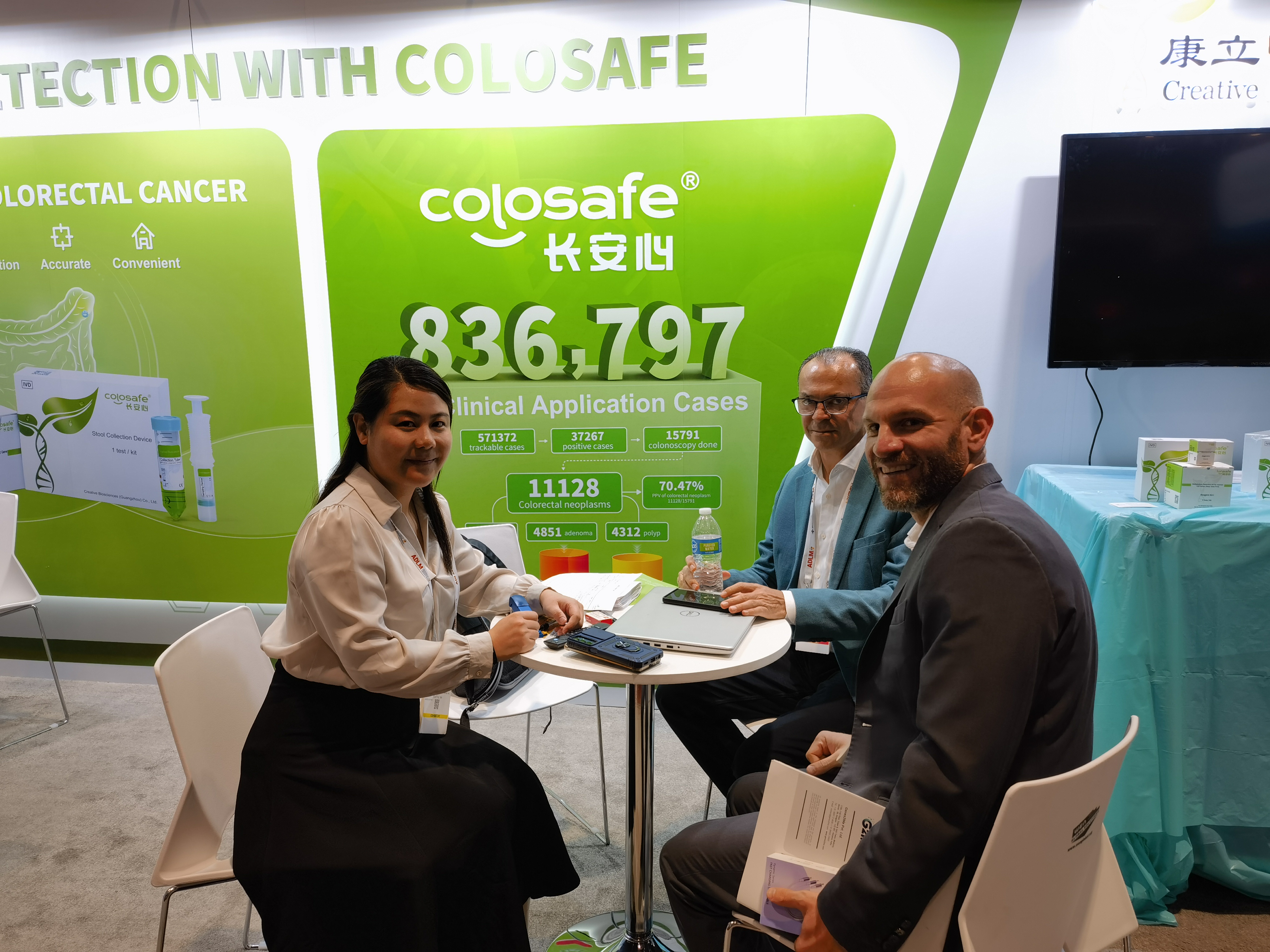 值得注意的是,康立明生物是本次展會中唯一一家提供結(jié)直腸癌早期檢測測試(包括分子測試)的生物科技公司。在展會期間不斷有來自世界各地的訪客對長安心®糞便DNA腸癌檢測技術(shù)感興趣。長安心®糞便DNA檢測技術(shù)是通過解讀糞便中脫落腫瘤細胞的基因異常改變,幫助醫(yī)生發(fā)現(xiàn)患者早期腸癌病變情況,有希望將結(jié)直腸癌阻斷在早期階段,從而達到預(yù)防和根治結(jié)直腸癌的目的。