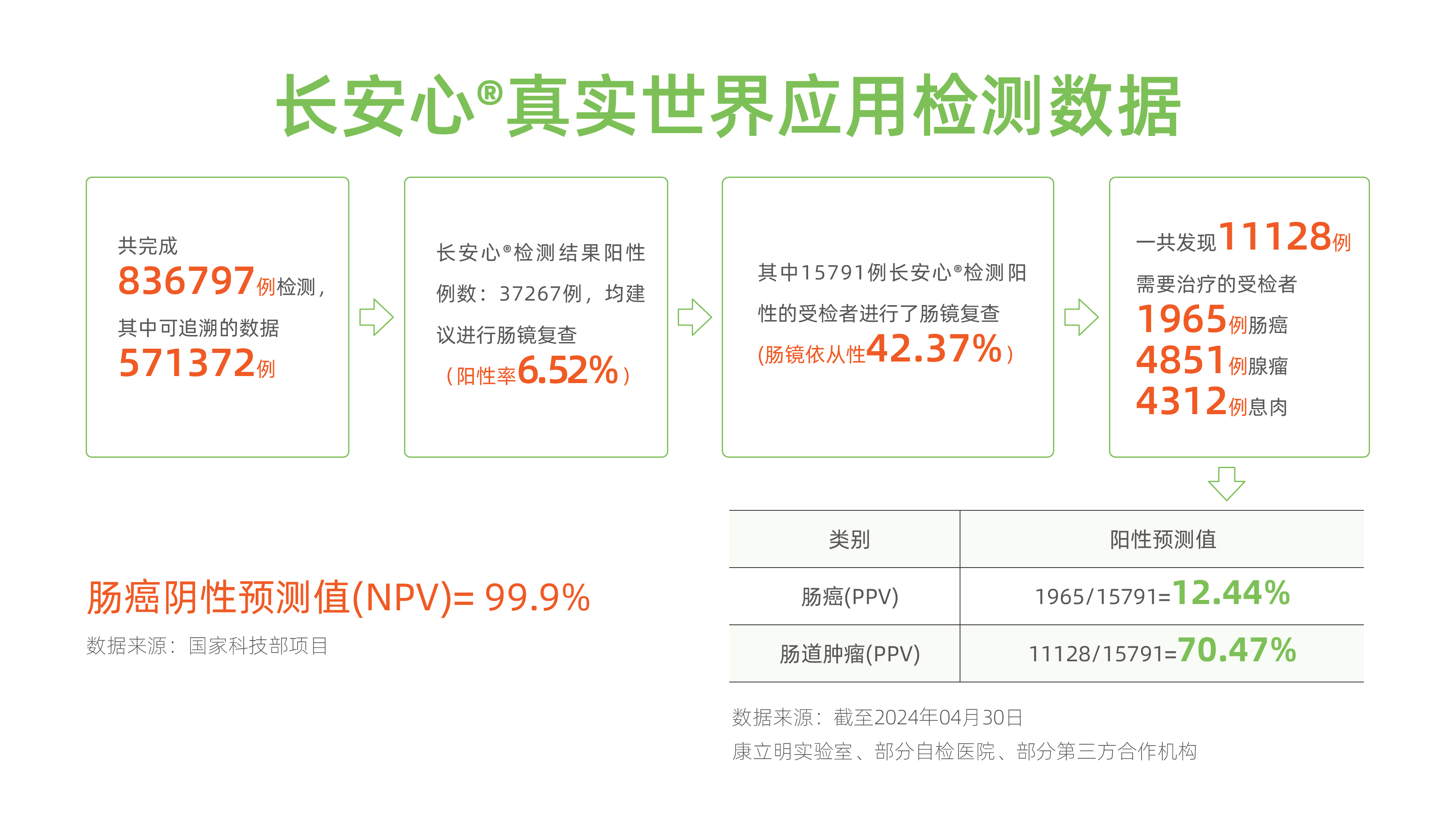 截至2024年4月30日,長安心®共完成836797例檢測,其中可追溯數(shù)據(jù)571372例。檢測結(jié)果陽性37267例(陽性率6.52%),均建議進行腸鏡復(fù)查。其中,15791例檢測陽性受檢者進行了腸鏡復(fù)查(腸鏡依從性42.37%),共發(fā)現(xiàn)11128例需要治療的受檢者,其中腸癌1965例、腺瘤4851例、息肉4312例。長安心®腸癌陽性預(yù)測值(PPV)12.44%,腸道腫瘤陽性預(yù)測值(PPV)70.47%,檢測性能優(yōu)異。