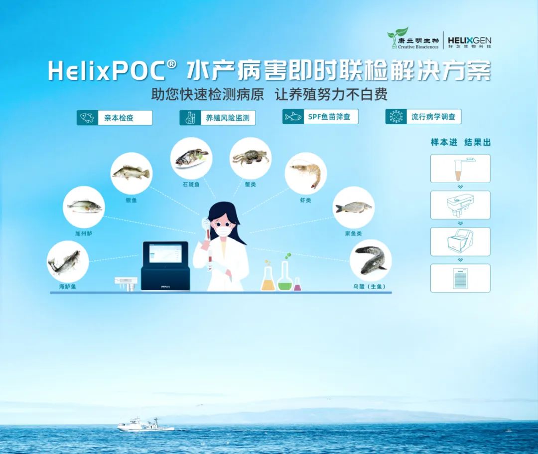 好芝生物以水產(chǎn)養(yǎng)殖病害防治為切入點(diǎn),以養(yǎng)殖物種為檢測服務(wù)單元,提出水產(chǎn)病害即時(shí)聯(lián)檢解決方案。產(chǎn)品基于HelixPOC®全自動微流控核酸檢測一體機(jī)、水產(chǎn)病害核酸檢測試劑盒,針對水產(chǎn)不同細(xì)分種類的病害,實(shí)現(xiàn)樣本進(jìn)、結(jié)果出的全自動化流程,無需專業(yè)操作人員及實(shí)驗(yàn)室,滿足現(xiàn)場快速需求,面向規(guī)?;?、集約化的水產(chǎn)養(yǎng)殖基地、種苗基地、水產(chǎn)檢測中心等場景。檢測水產(chǎn)養(yǎng)殖物種涵蓋南美白對蝦、羅氏沼蝦、克氏原螯蝦、小龍蝦、青蟹、鱖魚、加州鱸、海鱸魚、石斑魚、金鯧魚、草魚、烏鱧、鯽魚等 。